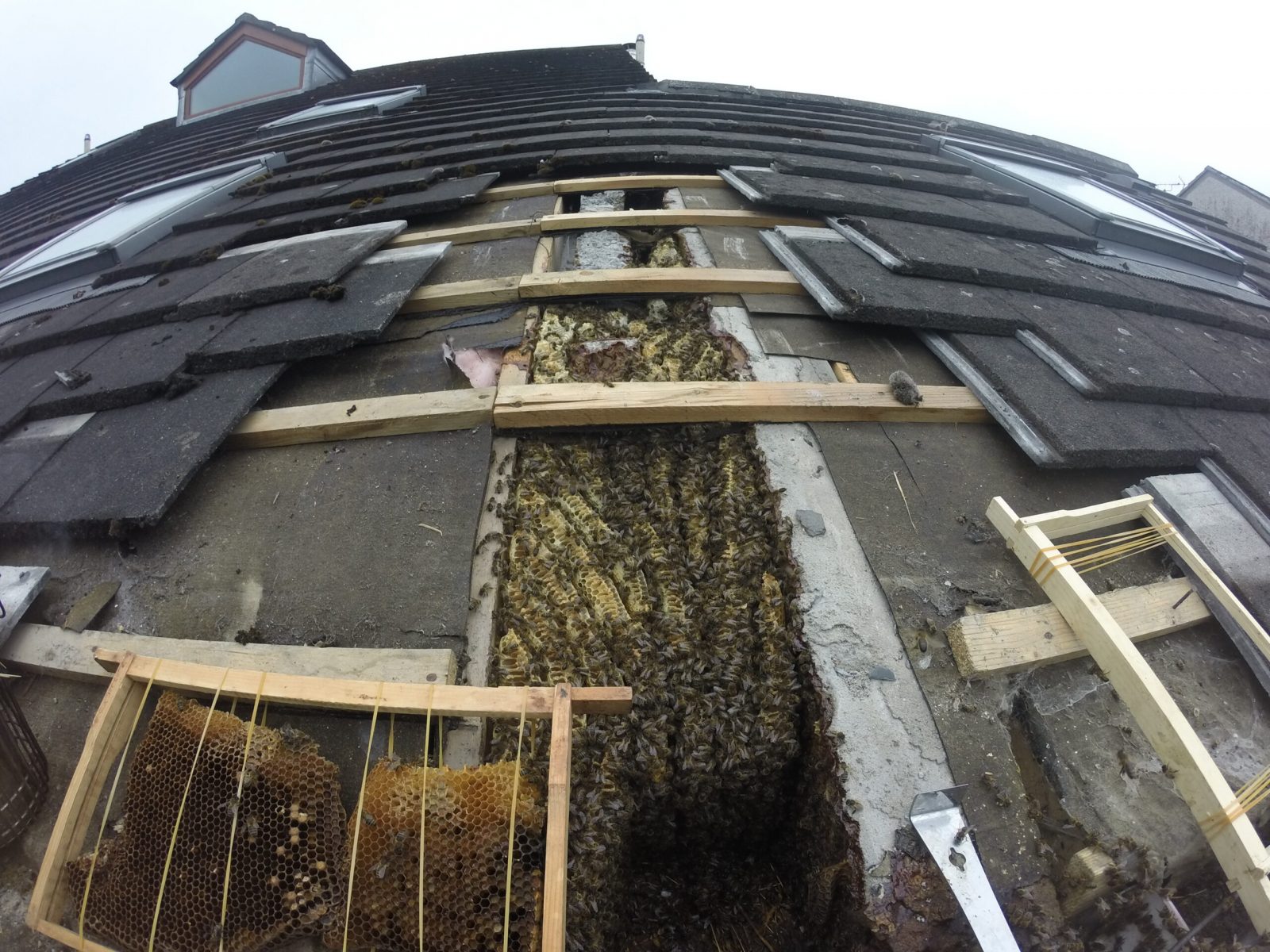 I visited the house and removed a few roof tiles to get a scope of the size of the colony. Straight away I could tell it was immense. I outlined what we would need to do and that she would have to get a roofer to repair the felt after the removal was complete and the straggling bees had dissipated. At that time of the year, it wasn’t great weather to open up the roof so we had to wait a few weeks for the weather to pick up before we could plan it in.