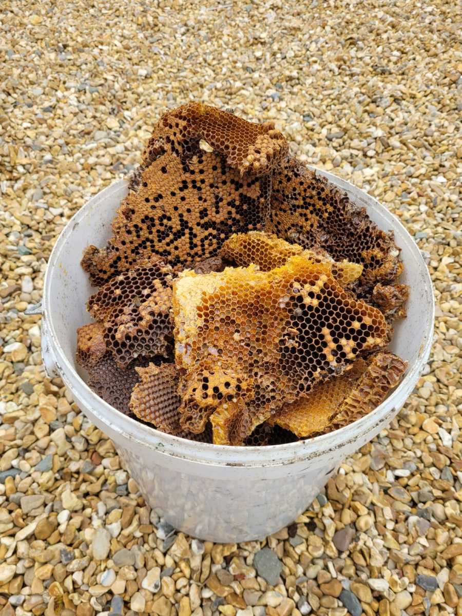 With the vac box built we set about sucking up the bees and removing the comb piece by piece. It was a long slow process but we were able to remove everything and pull the majority of the bees into their new ready-built home. The removal took most of the day. We removed many buckets of comb and honey from the roof space. Established colonies of this size can be particularly aggressive when being removed and this was no exception.