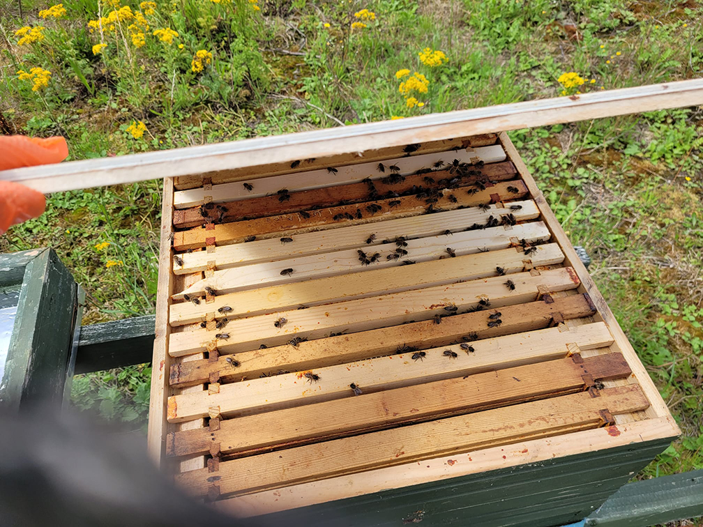 We relocated and released the bees the following day and left them to settle in. The following week on inspection I found eggs and larvae. Going through the hive I located the queen, clipped a small piece off one of her wings and put a yellow dot on her back so I could find her again easily.