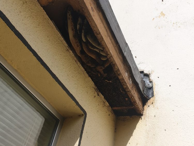 To understand why honey bees select dwellings and buildings to set up home, we need to look into the dynamics of honey bee colonies. While colony numbers can grow to between 40 and 60 thousand member it is still classed as one entity or super organism. When a colony is successful in an area, they feel the drive to reproduce and swarming is their option. Swarming begins by the queen laying up queen cell to produce new virgin queens, in some cases up to twenty. The original laying queen will then take the flying bees, roughly half the colony, loaded up with stores and will leave the hive to set up home somewhere else. This first swarm called a prime swarm can be quite intimidating to see as it looks like a tornado of bees. When the first virgin queen emerges, they may decide to split again if strong enough and produce a second swarm called a cast swarm. This may continue until the colony is just strong enough to survive and the remaining virgins will fight until there is only one queen left. This means one un-managed colony could reproduce and set up multiple new colonies each season populating the area around the original hive.