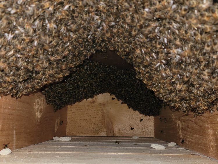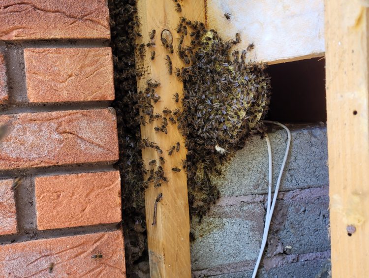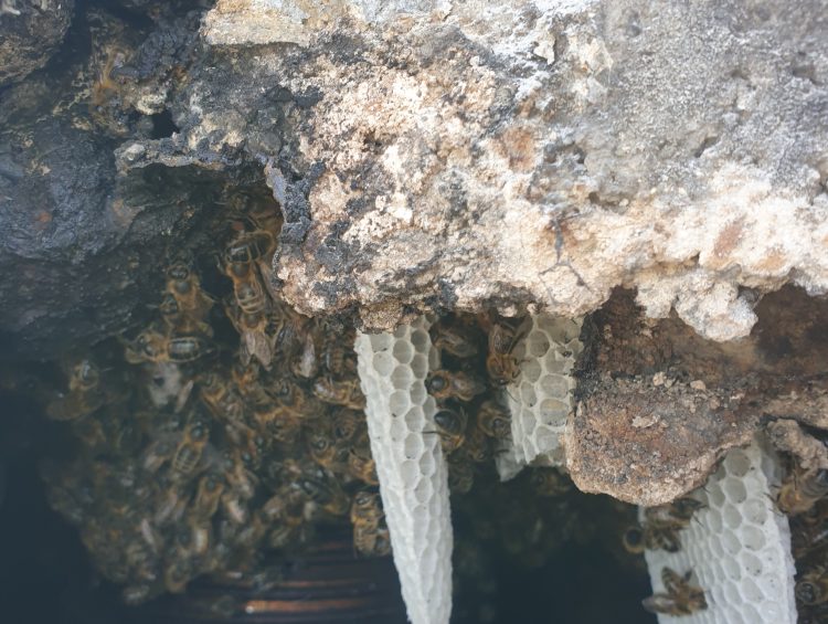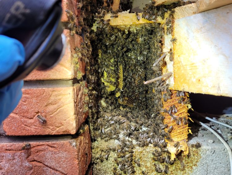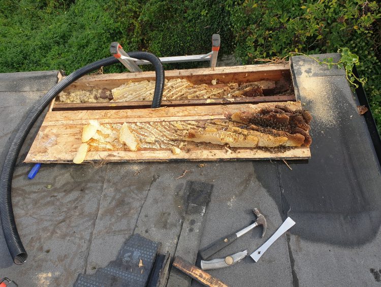 Let’s look at what shouldn’t be done first. Pest control companies are usually the first to be called out when a colony is discovered in a dwelling, because most people identify honey bees with yellow and black stripes. Our native Irish honey bees often get mistaken for wasps. Pest control companies are able to deal with wasps very efficiently using a nerve agent powder. This procedure should never be used on a honey bee colony. Wasps do not build comb or store honey so a nerve agent with kill the members of the nest and all that is left is a paper like structure which is of no interest to other bees and pollinators. Honey bees on the other hand have comb, honey, pollen and propolis which would attract any and every type of insect/pollinator to rob the unoccupied colony out. This action would result in the decimation of the bee and pollinator populations for miles around and most if not all pest control companies will refuse to perform this action because the nerve agent will stay active for a very long time. Also, which we have seen in places is a beekeeper removing the bees and leaving the comb in place, so essentially leaving a free, ready built home for another swarm to move into which is very counterproductive.