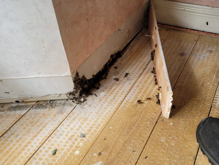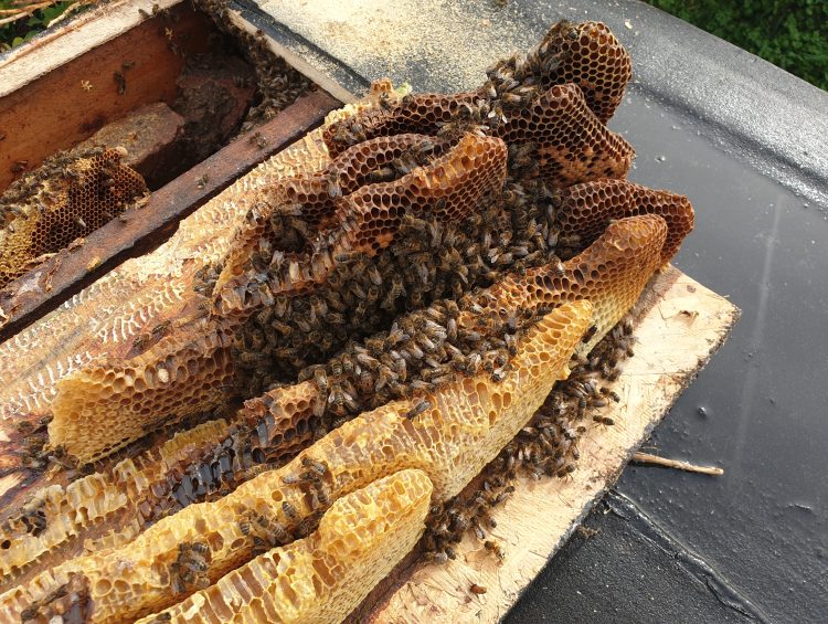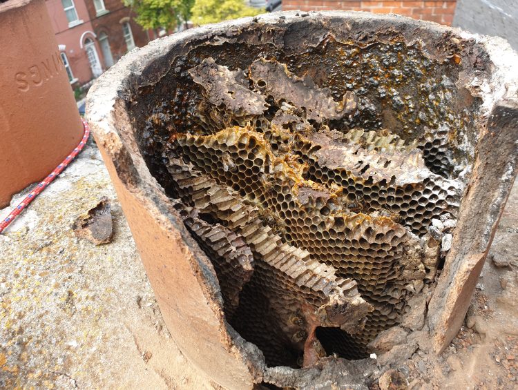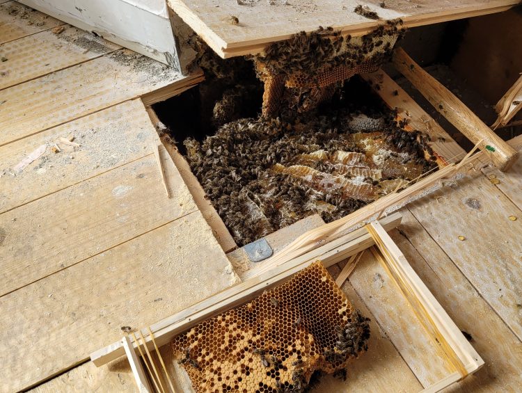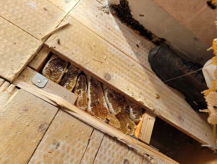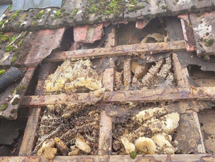 Damage to the property is also a big issue when it comes to colonies in buildings. Honey bees need a very small opening to access a property but what they build inside can be enormous. Some removals we have completed weighed in at over 500kg of comb and honey. This weight in a building or roof would cause serious structural damage. Honey bees will often remove large areas of insulation as they grow in size and debris from comb the bees drop during normal hive activity tends to mould on ceiling etc. As stated, before honey bees do attract predators like wasps which are aggressive in nature and wax moths drawn to old comb can explode in population numbers. Lastly and probably the most important issue is the comb itself, wax which we all know is flammable. Wax can be a huge fire hazard, we have seen and removed colonies that set up home in chimneys. If they went unnoticed by the occupant and a fire was lit, they could potentially have a huge candle burning in the middle of their house. One particular removal in Kells last year (2022) where a colony set up home in between floor joints was extremely hazardous because they had built around cables running to sockets. As mentioned before, mice are a pest to honey bee colonies and if a mouse chewing through that comb hit the cable it would have been a disaster.